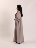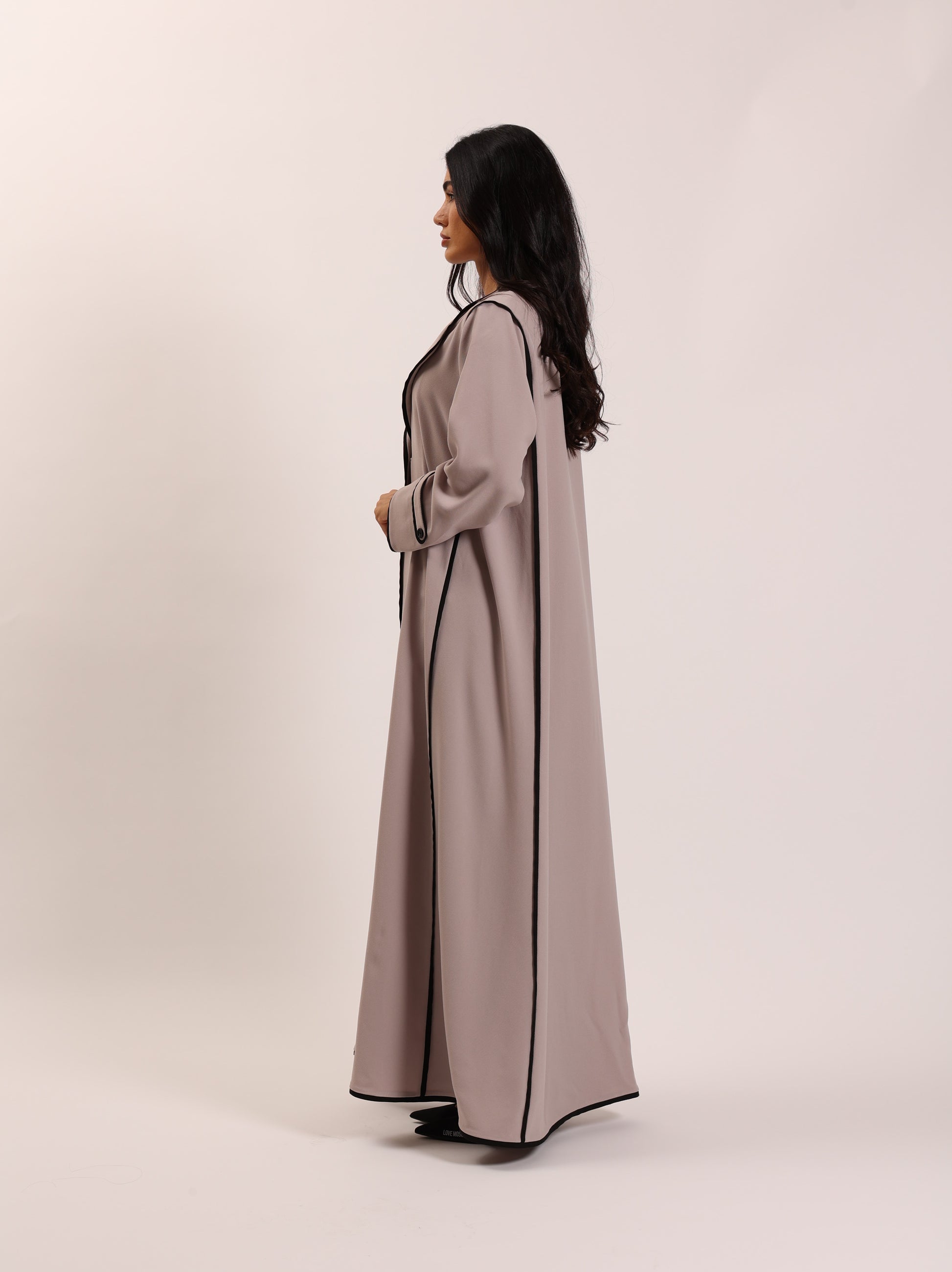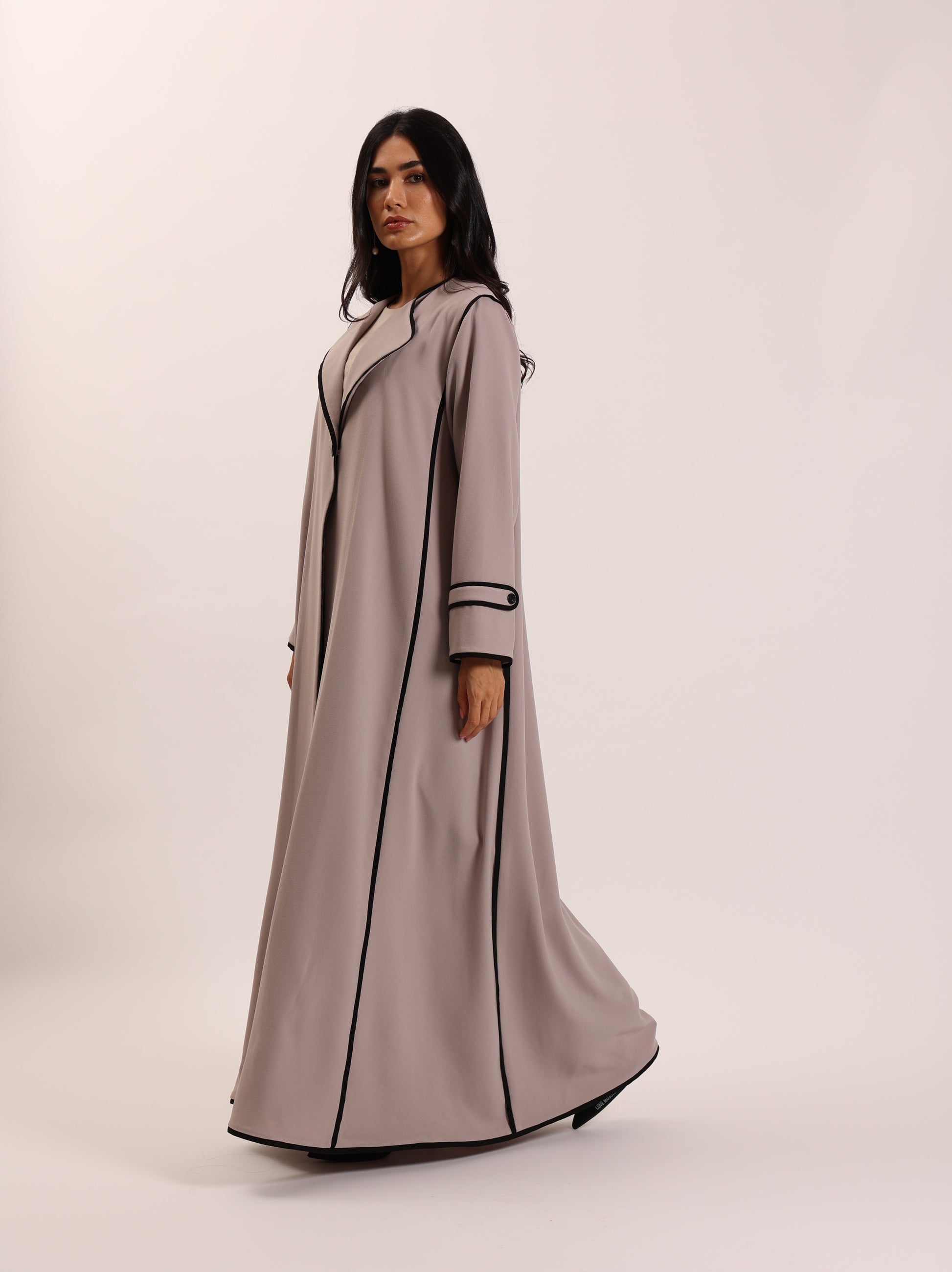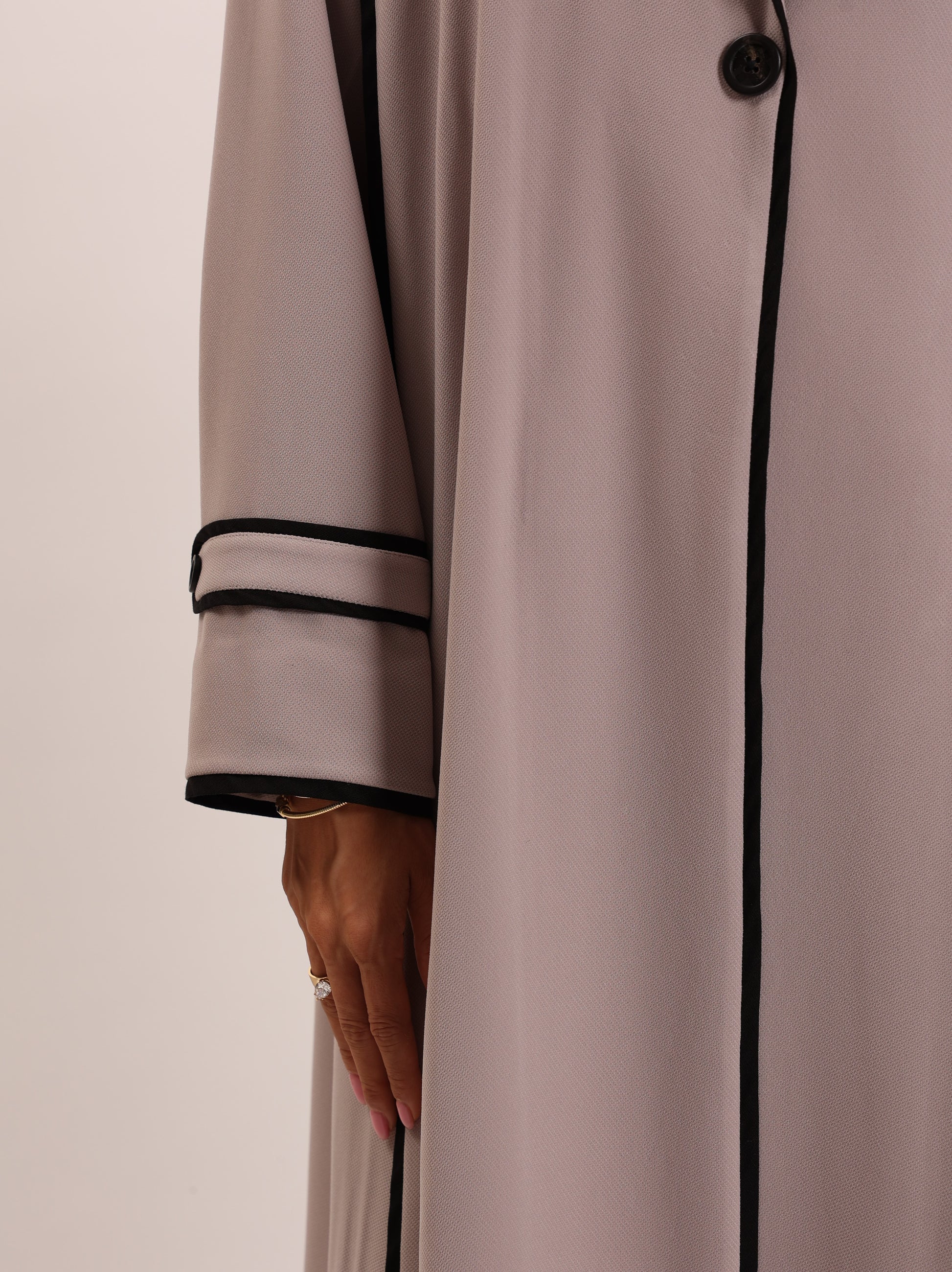 عباية سايلين بلون البيج الناعم وتتميز بخطوط تحديد أنيقة باللون الأسود على الحواف والأكمام. تجمع بين البساطة والرقي، مما يجعلها مثالية للمناسبات الرسمية والاستخدام اليومي على حد سواء.