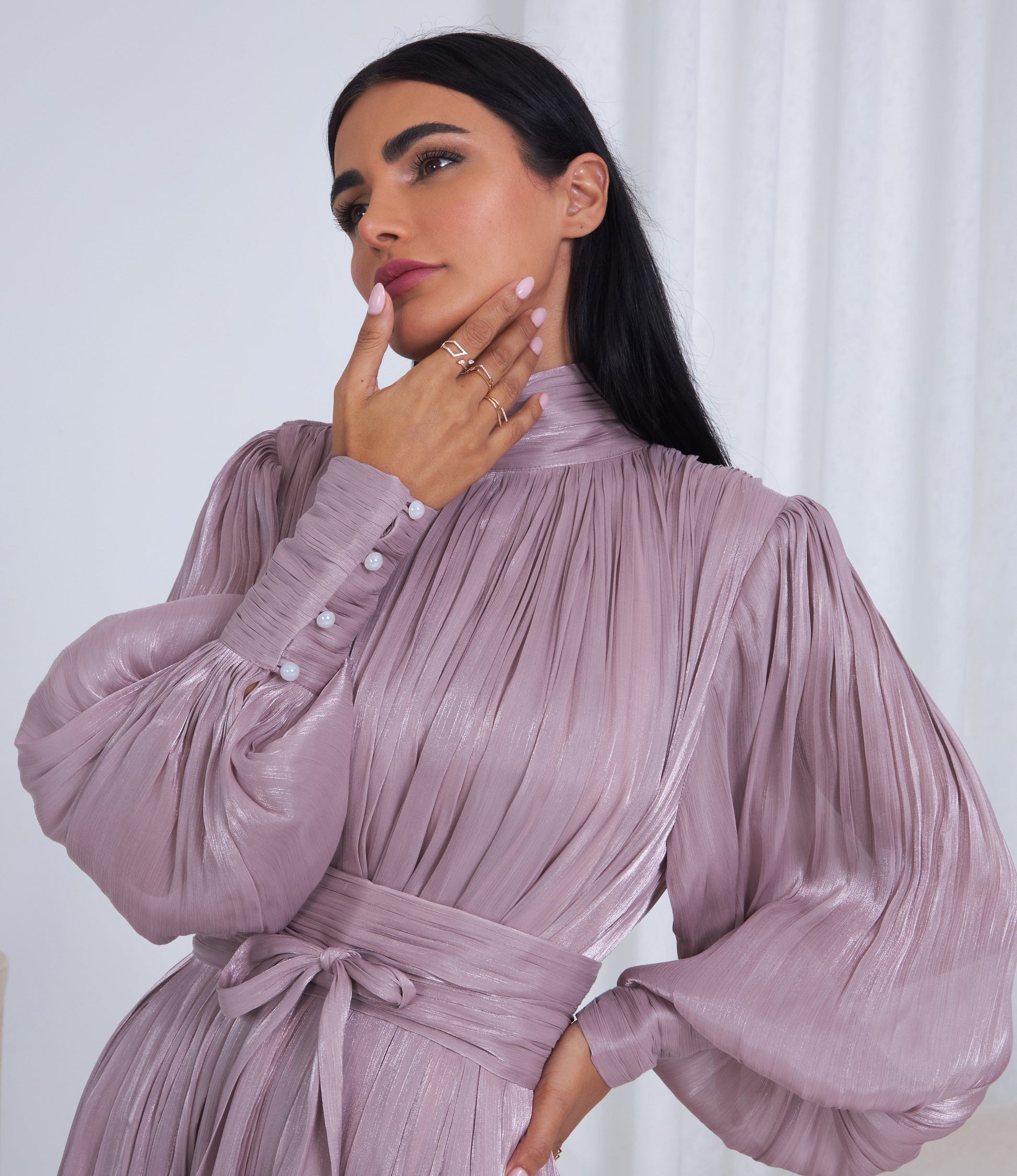 Arona Dress in elegant Purple hue. Crafted from luxurious flowy chiffon with a high round neck, long puffy sleeves, and pearl-buttoned cuffs.