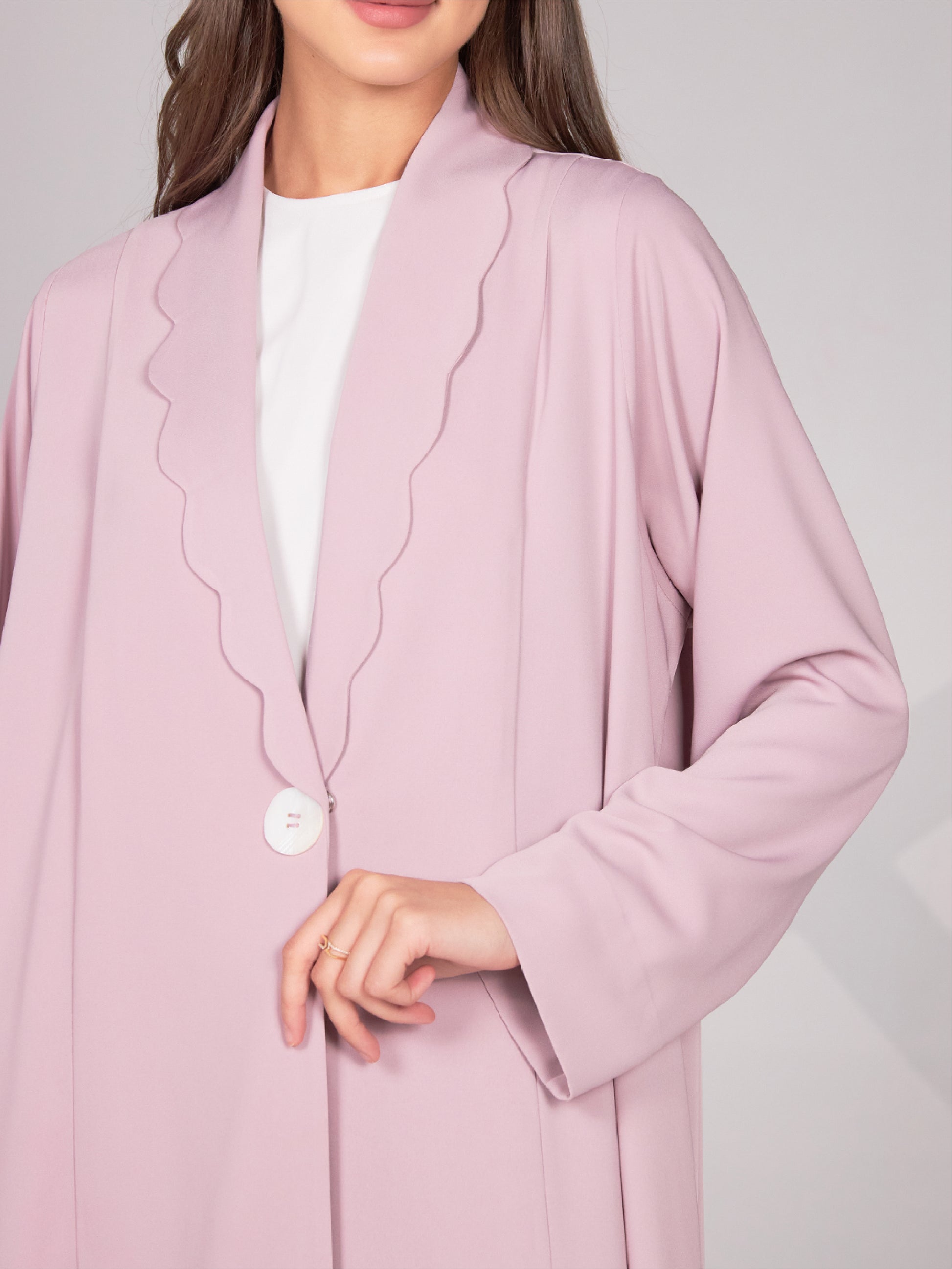 Elise is a collared coat style abaya with formal details for a one of a kind look. It's tailored from soft crepe fabric with detail edges on flounce the collar. Wear it to your next work event.