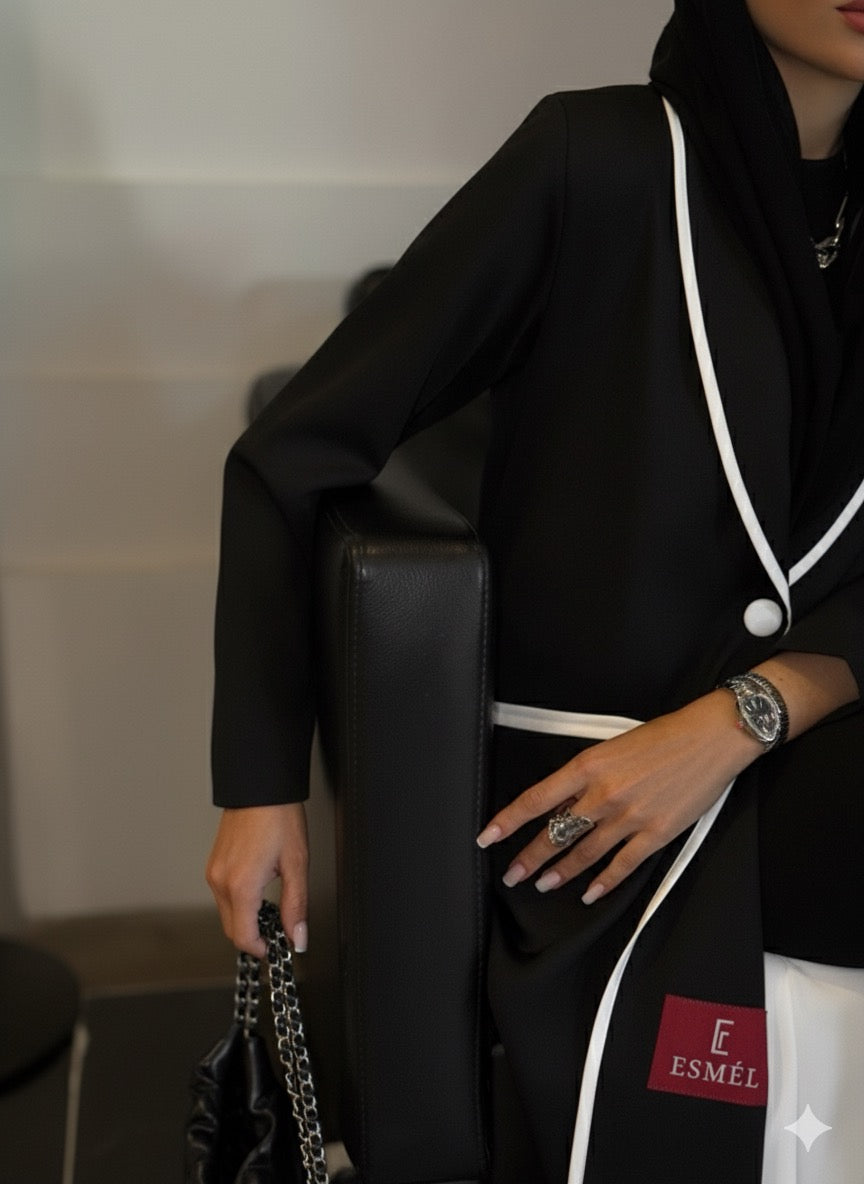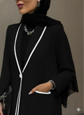 Layan is a chic black abaya featuring a classic blazer-style collar with bold white piping for a refined touch.