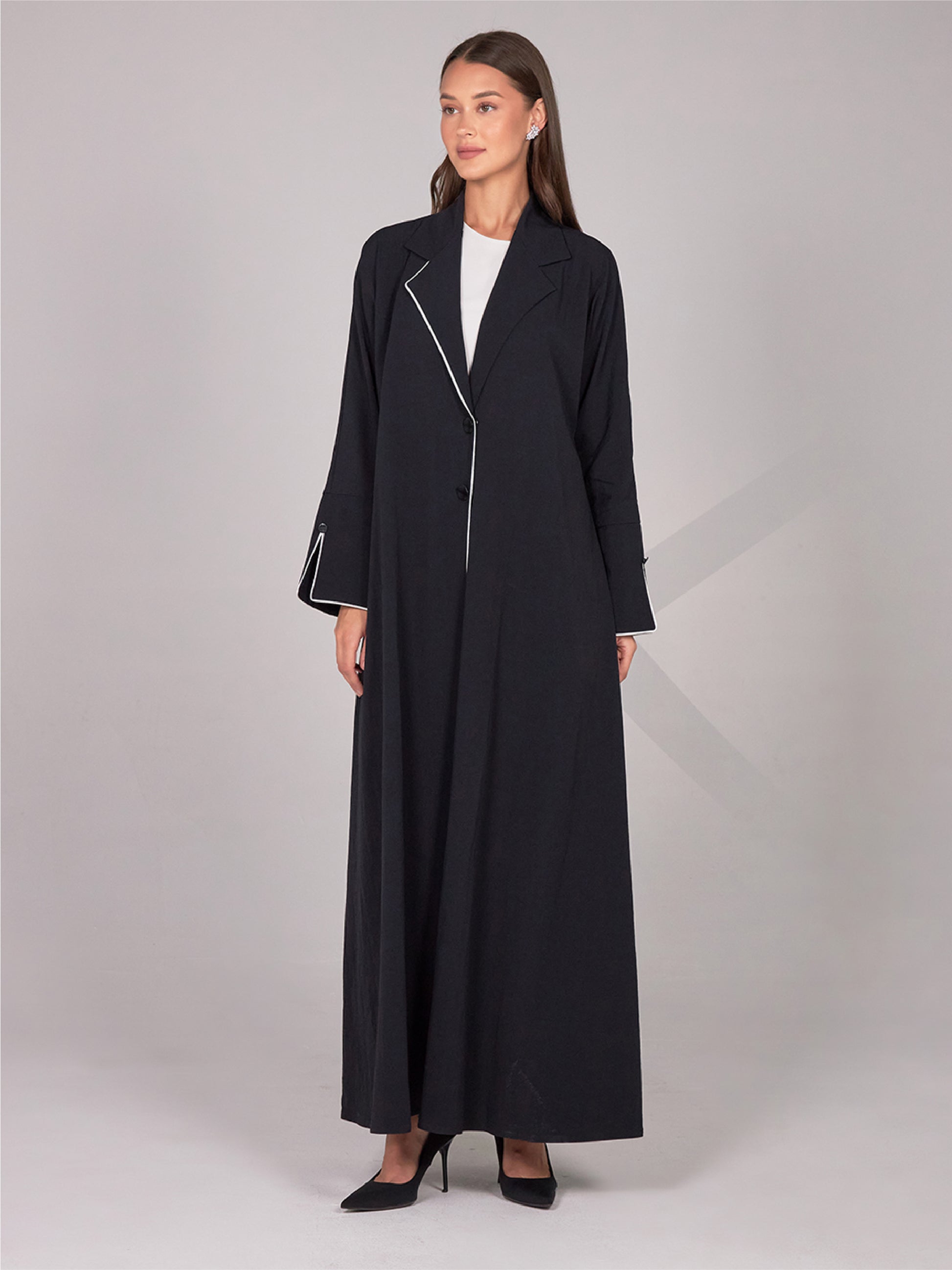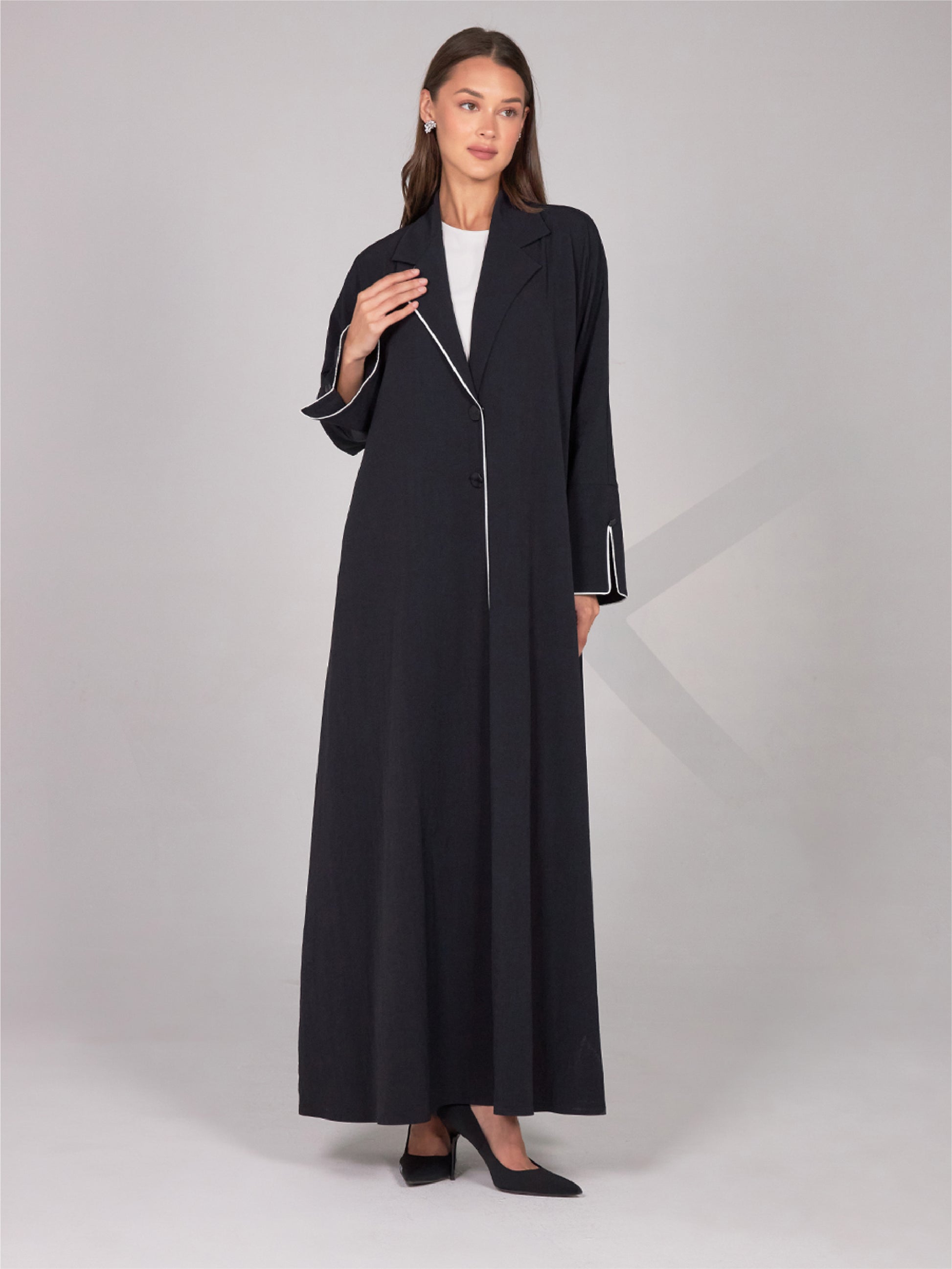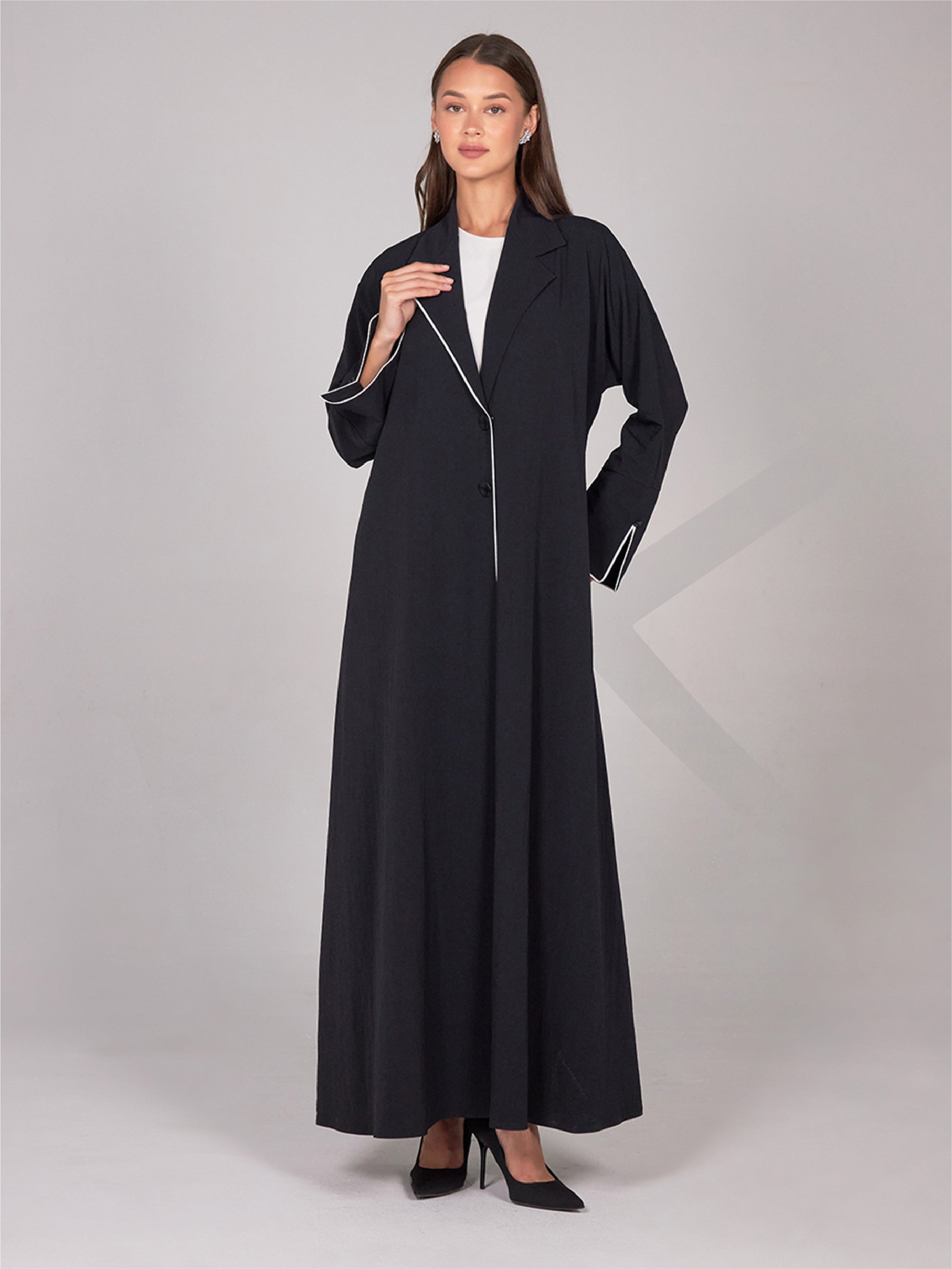 IVA is a Semi-Formal abaya, featuring elegant line-shaped white piping on one side front and on the sleeves.