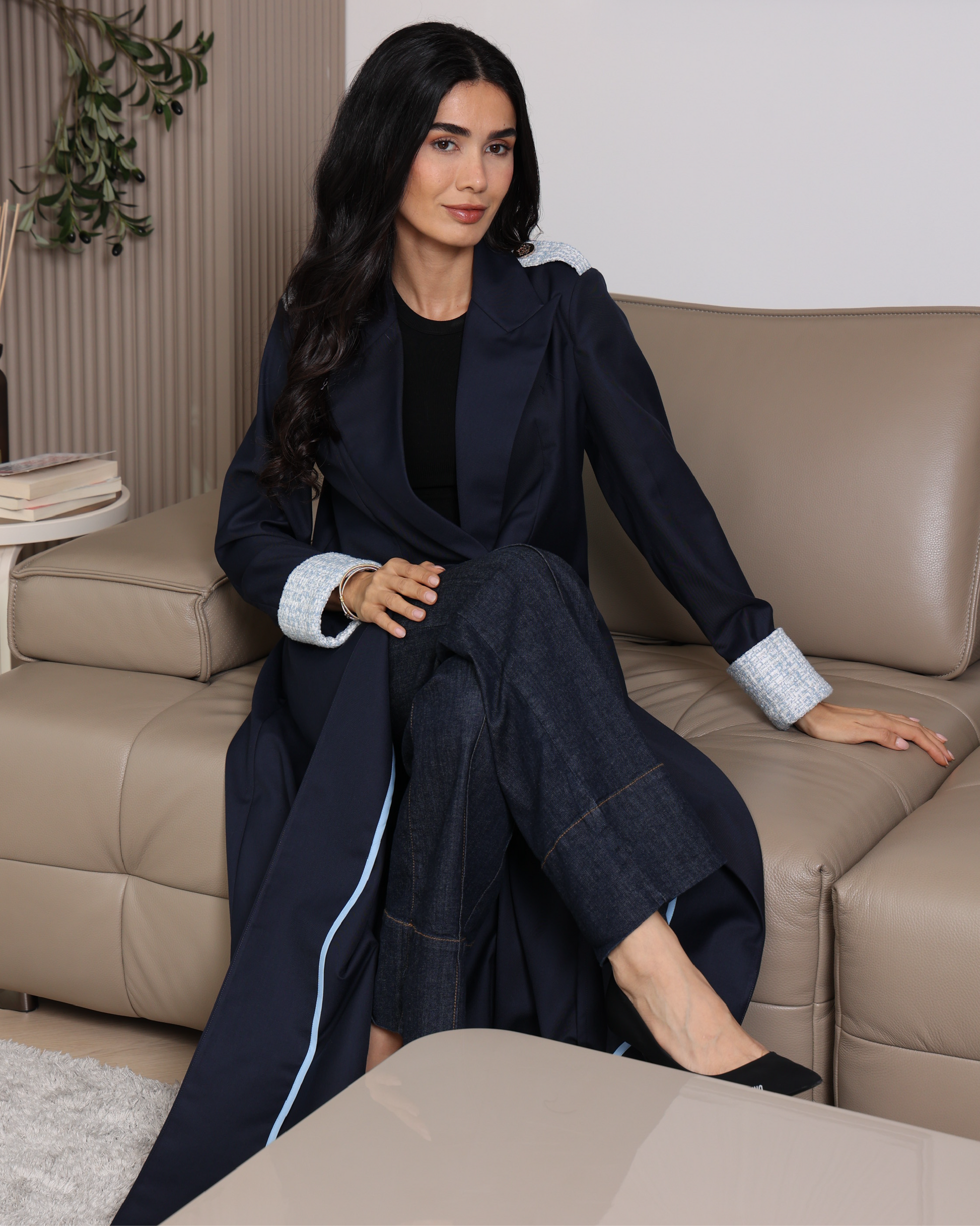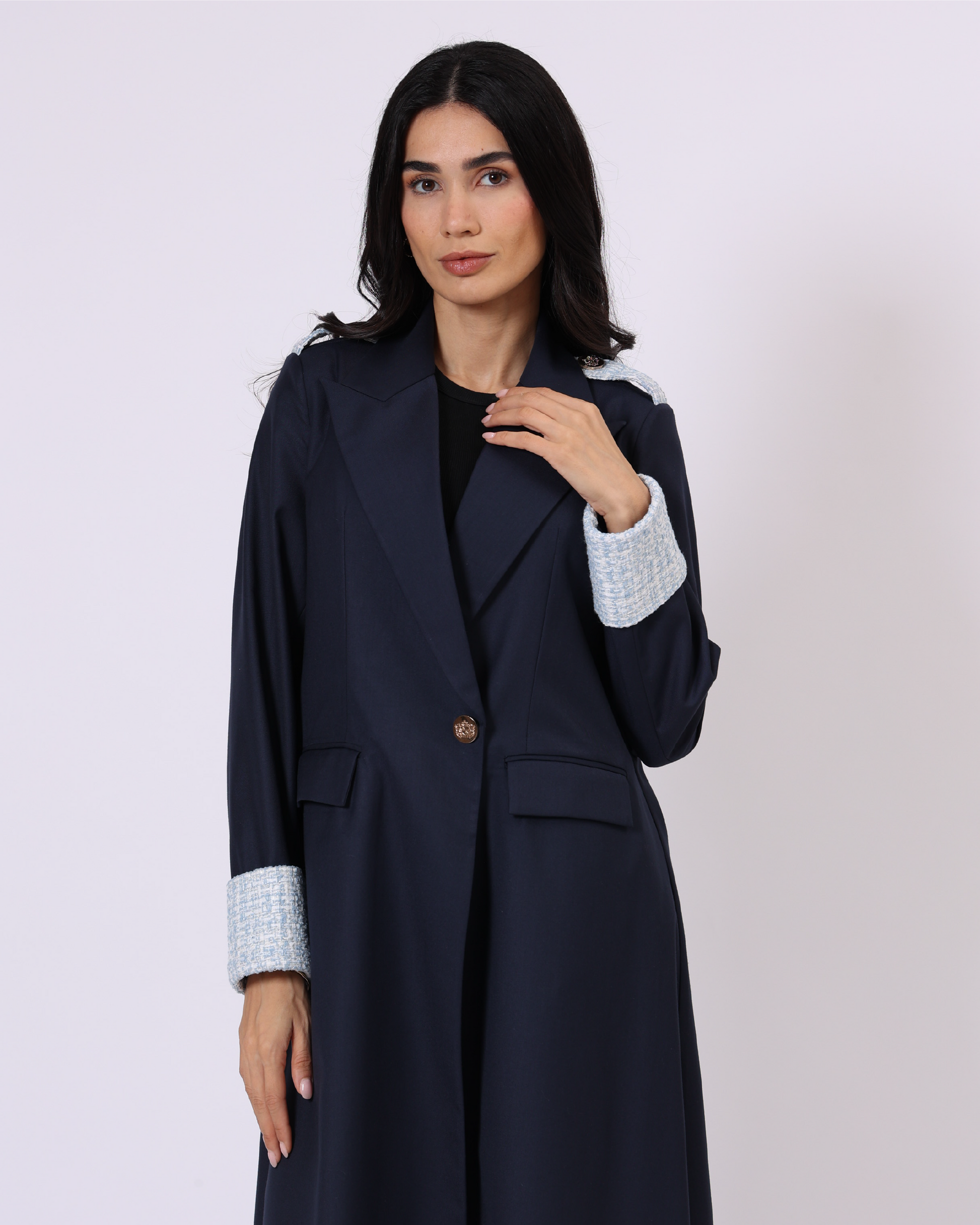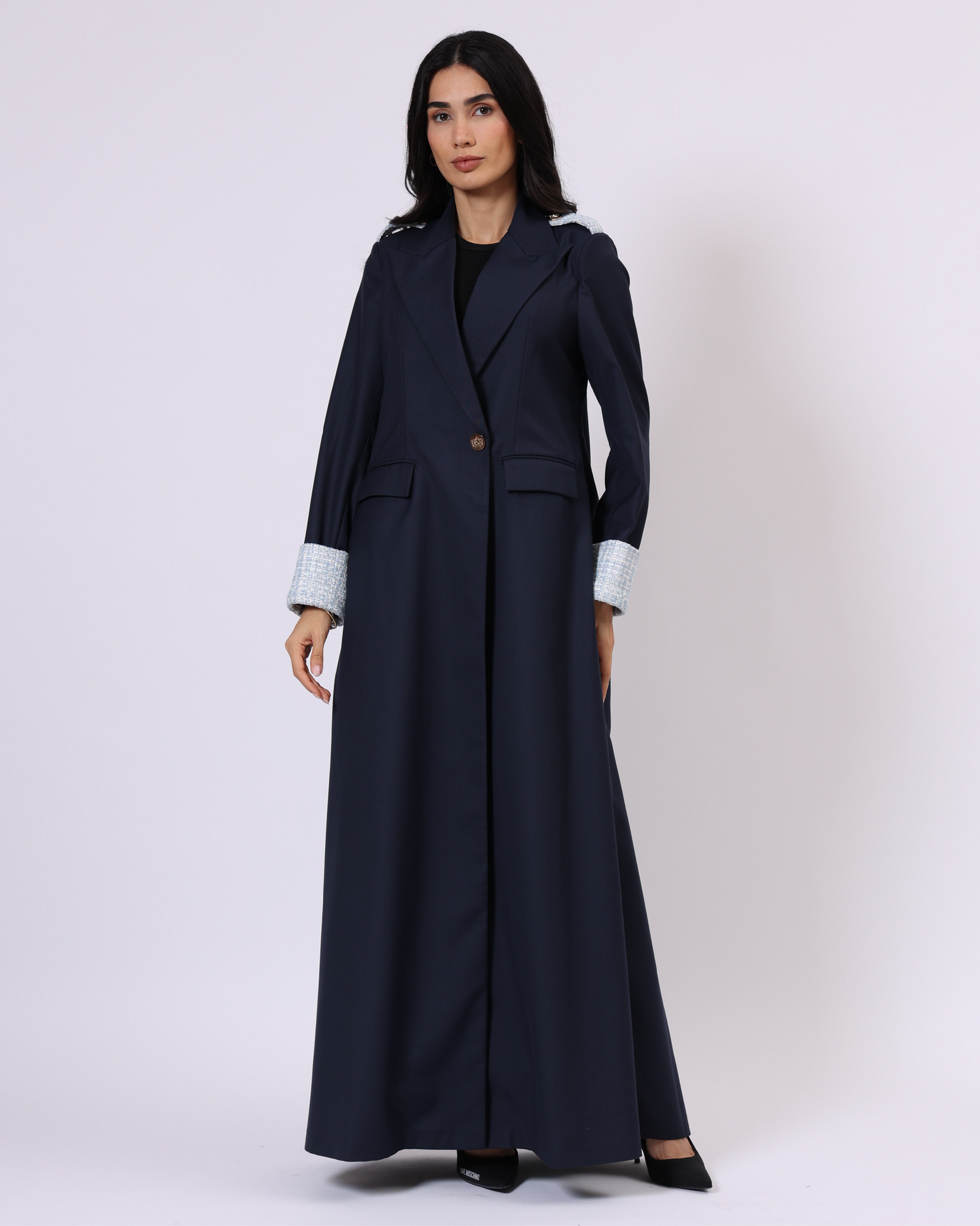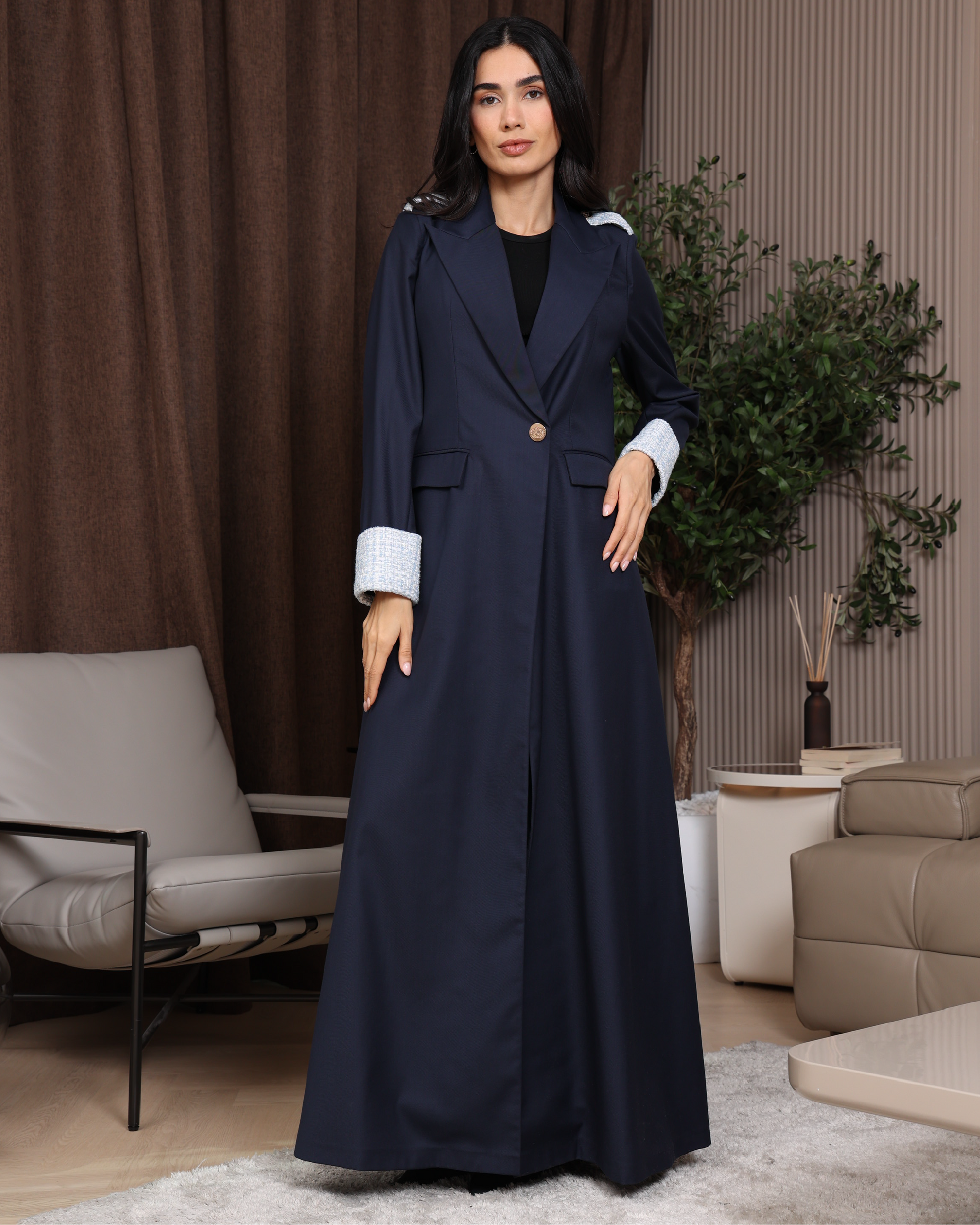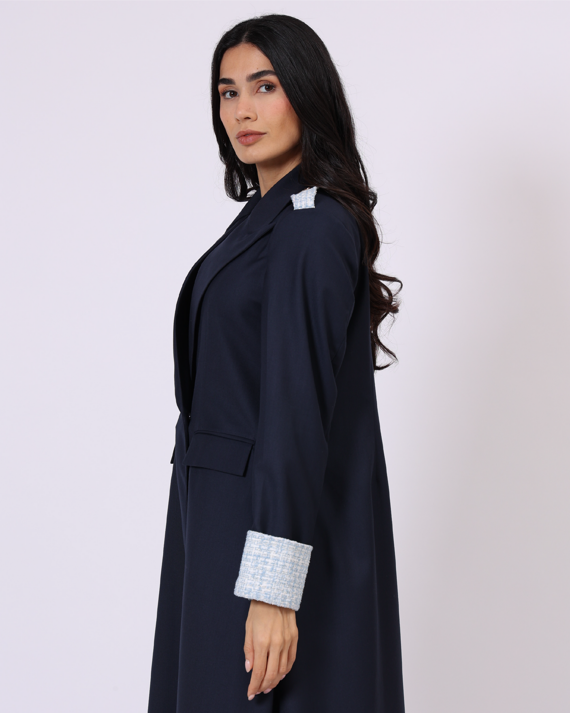 ـJana abaya in navy color,A-line cut crafted from breathable cotton fabric, designed for everyday comfort and effortless elegance. It features colorful tweed accents on the cuffs and shoulders, complemented by a visible pocket that adds a practical yet modern touch—perfect for work and daily wear.