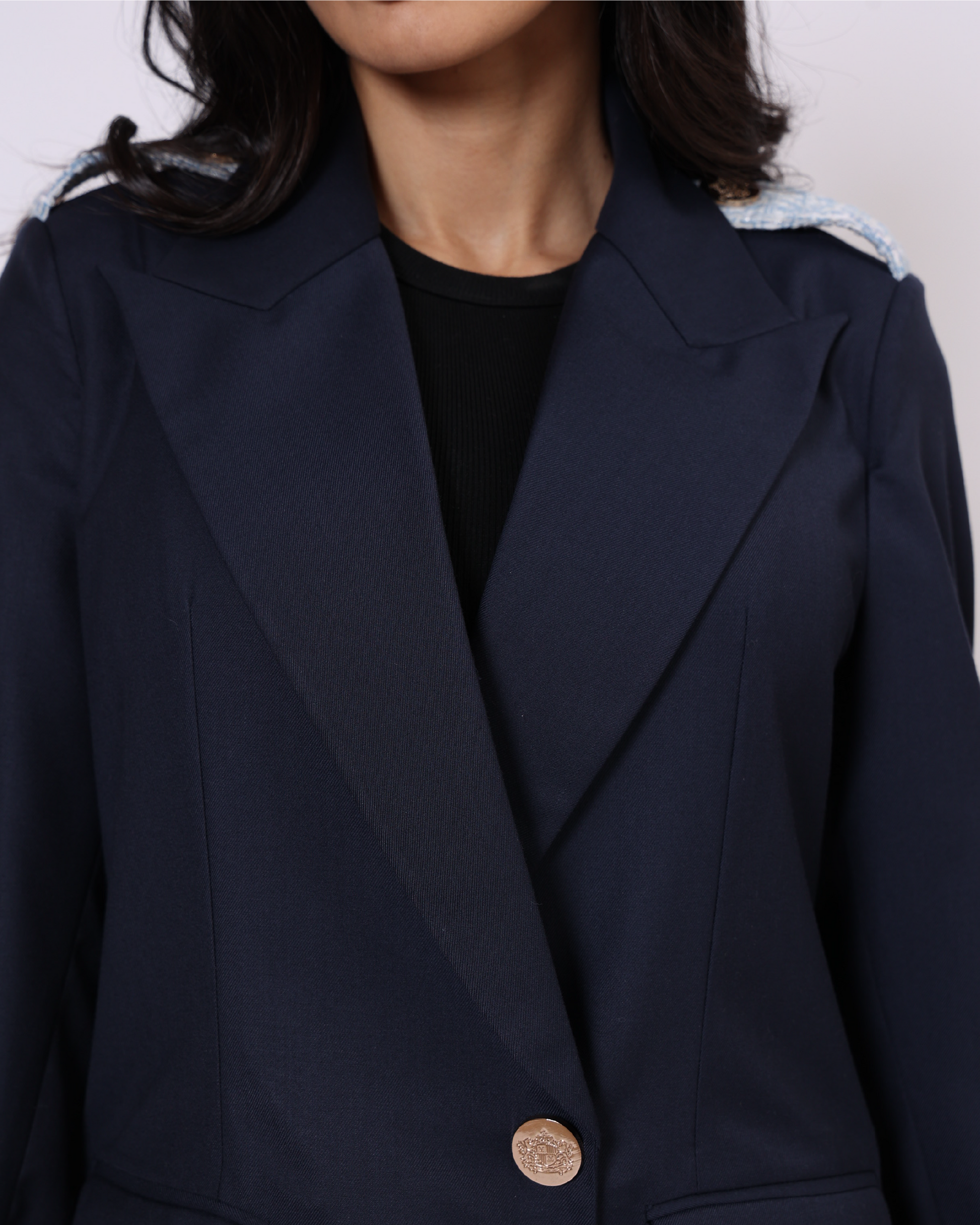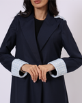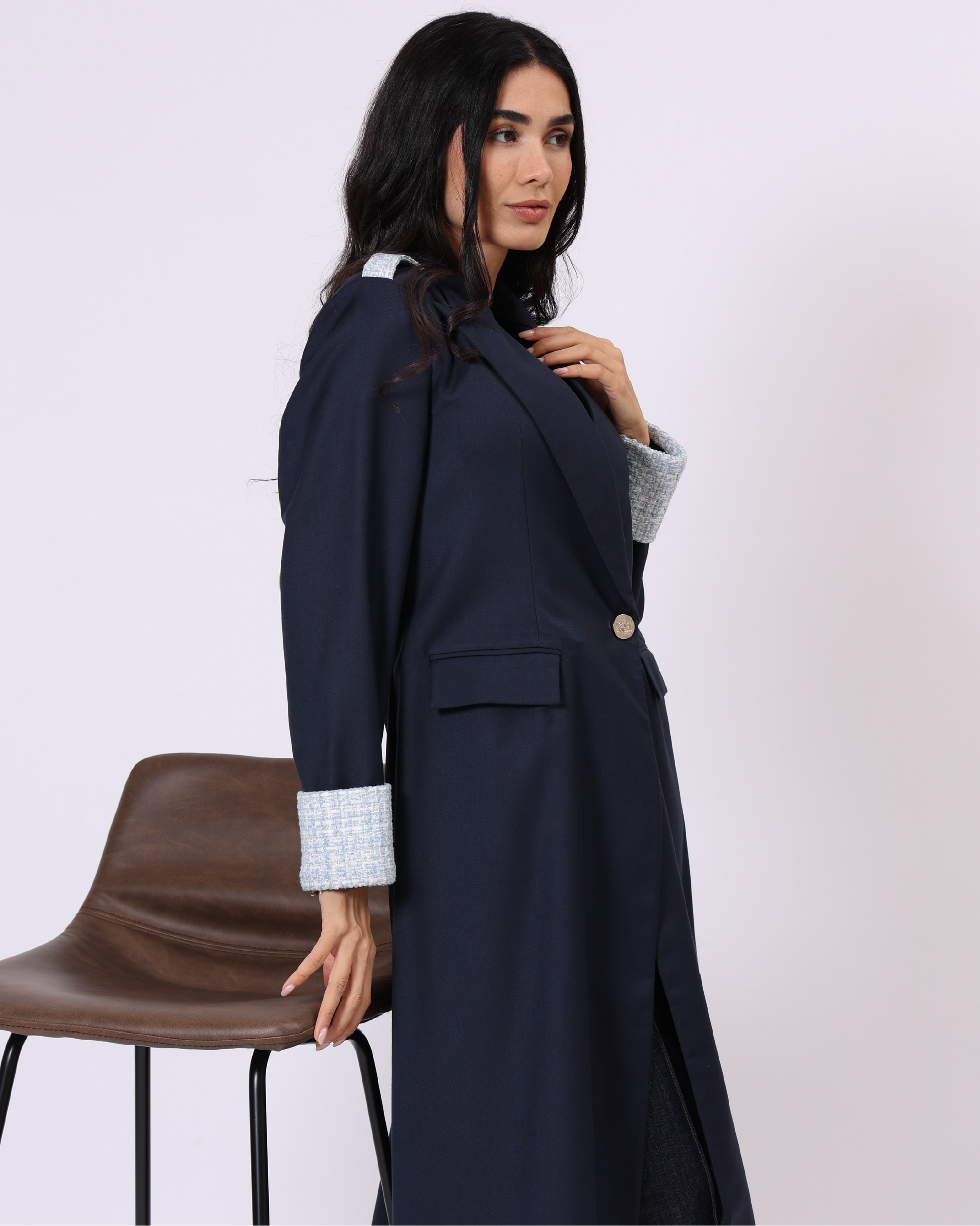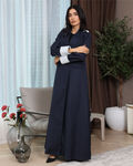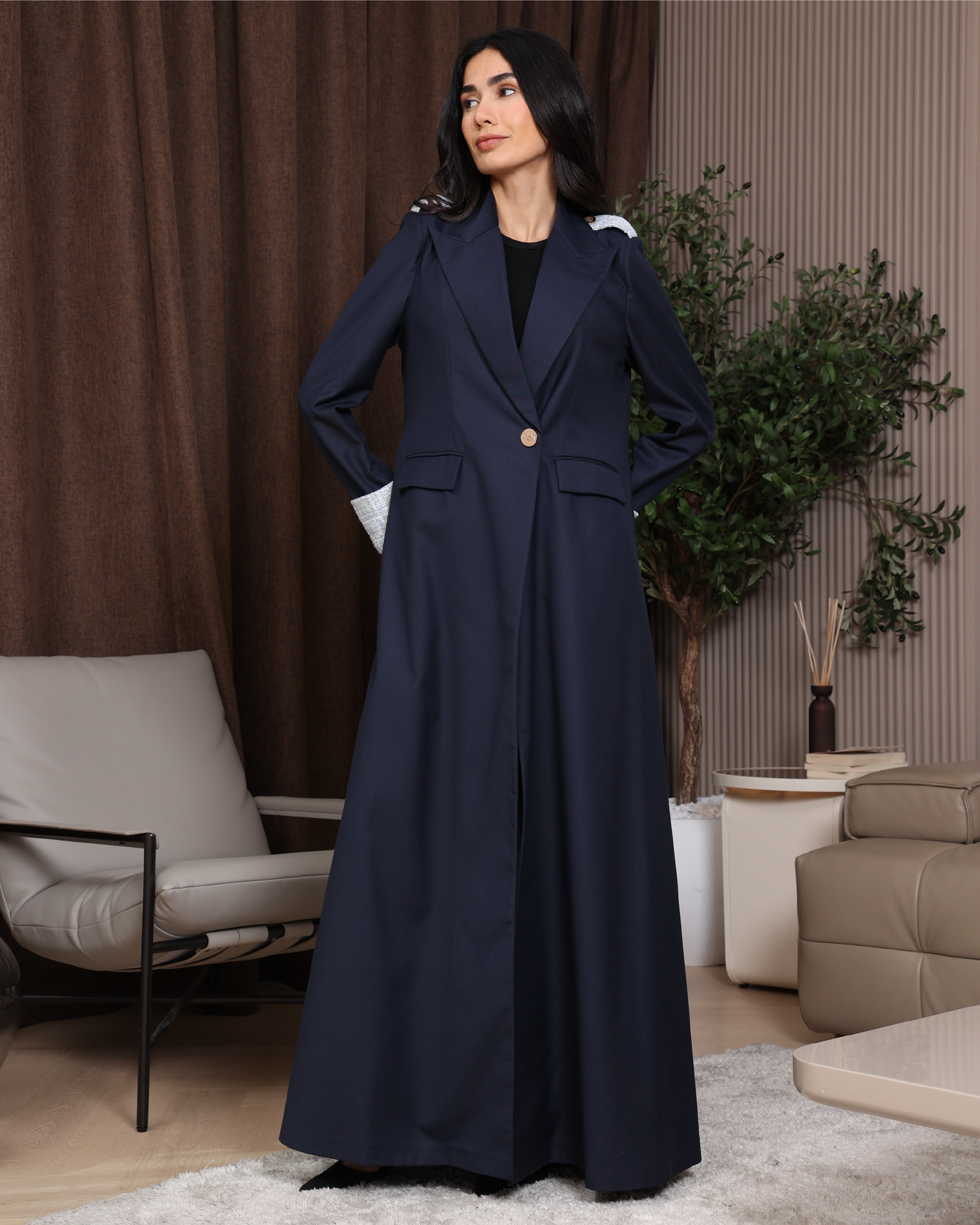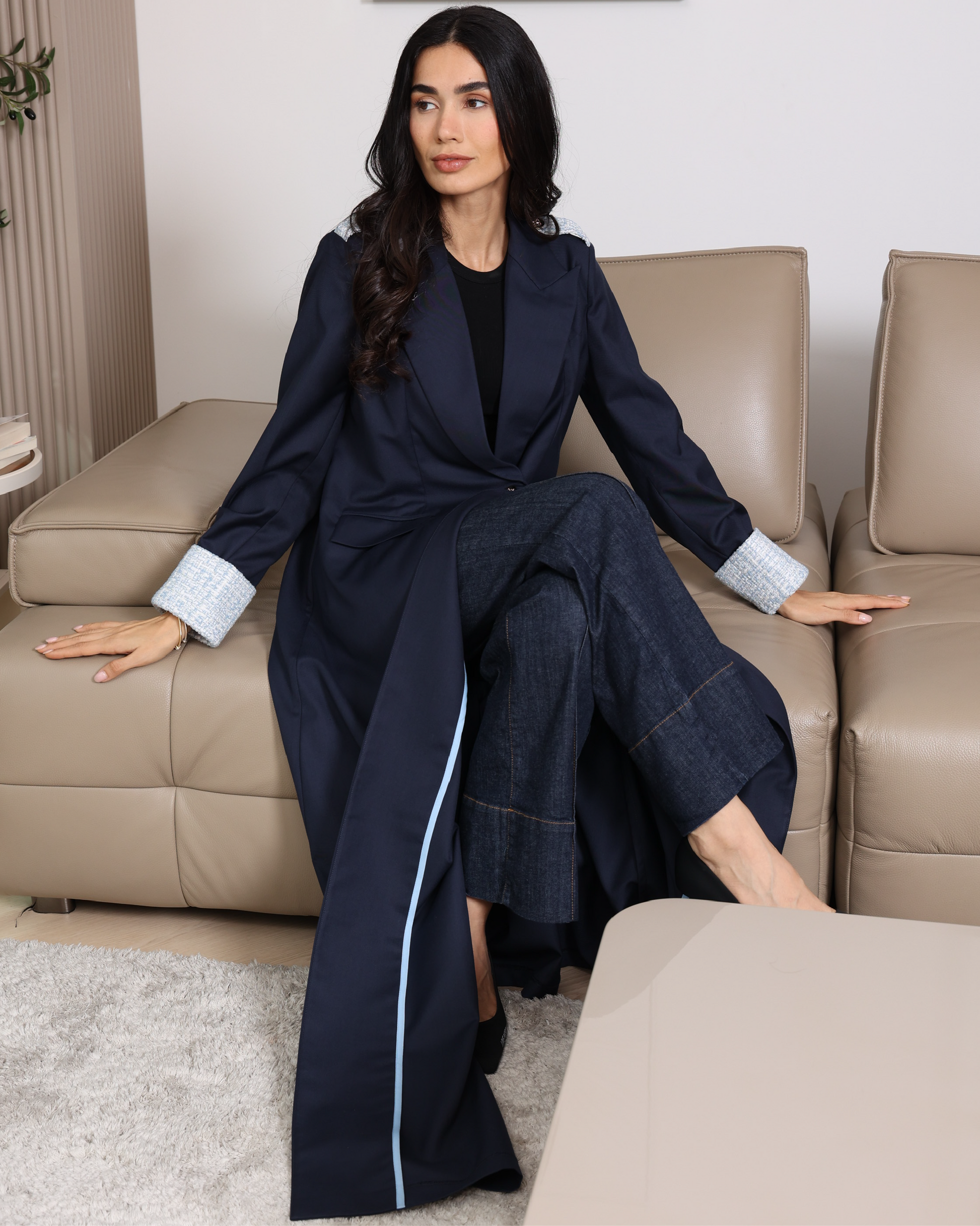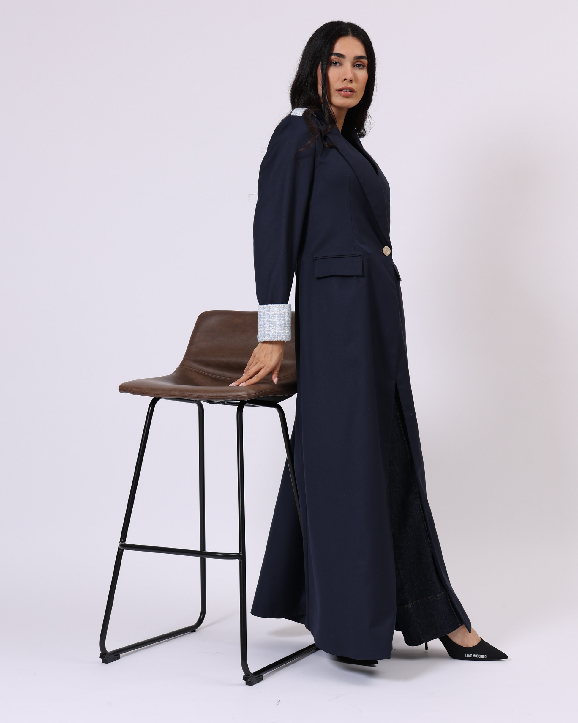 ـJana abaya in navy color,A-line cut crafted from breathable cotton fabric, designed for everyday comfort and effortless elegance. It features colorful tweed accents on the cuffs and shoulders, complemented by a visible pocket that adds a practical yet modern touch—perfect for work and daily wear.