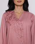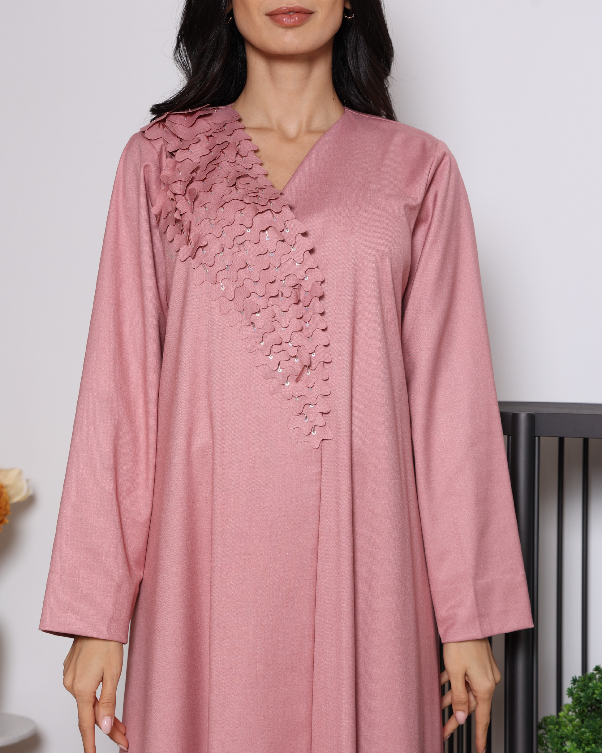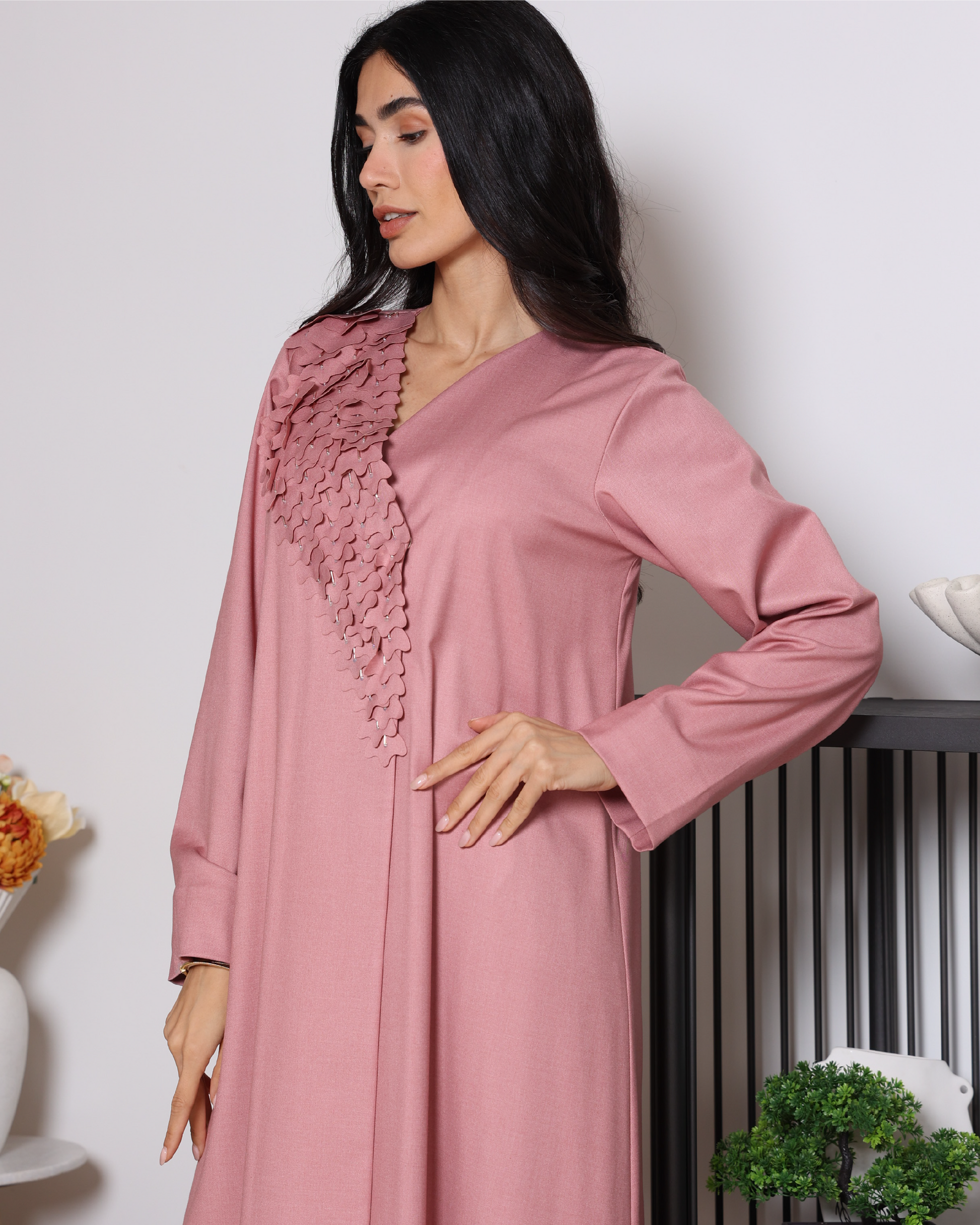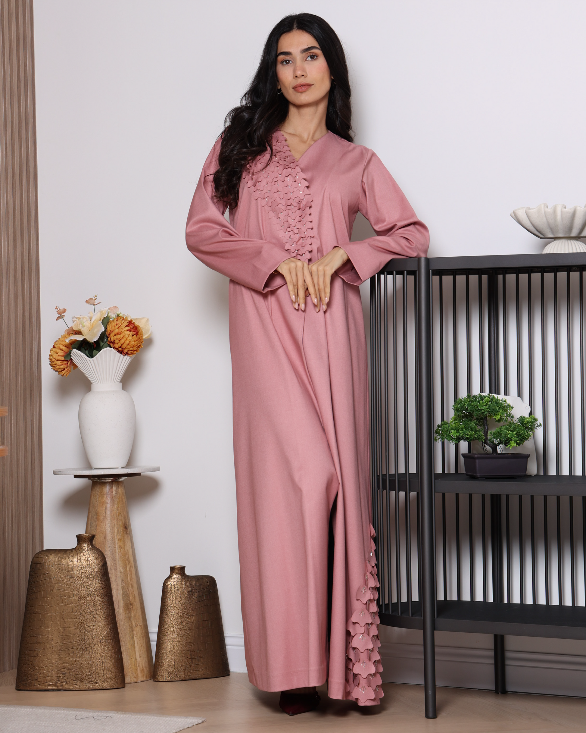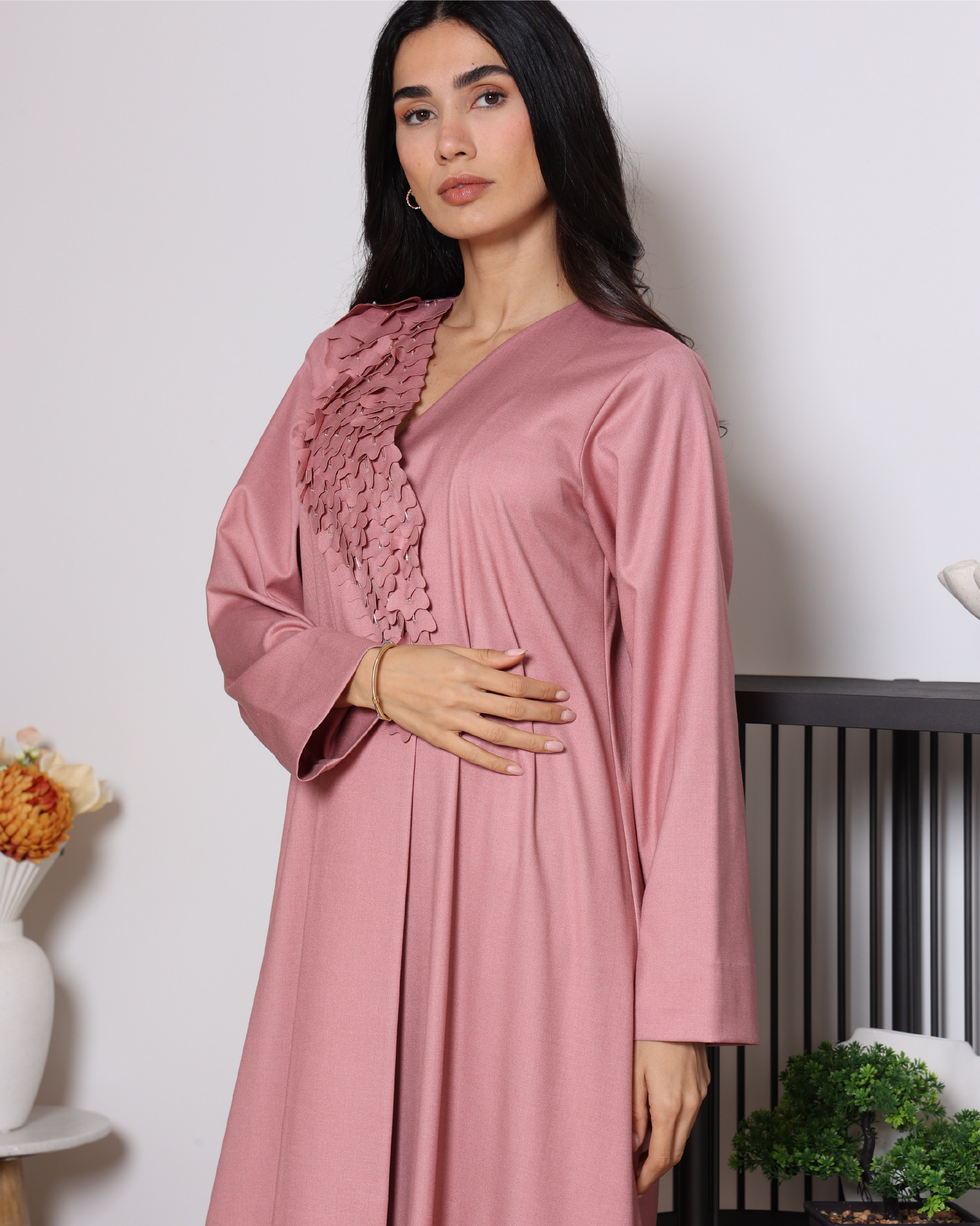 The joury in an elegant abaya crafted from soft wool fabric,featuring a fluid silhouette and refined details that add a subtle touch of luxuary.A perfect choice for a sophisticated and comfortable look.