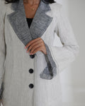 A chic two-piece set in light grey with a contrasting dark grey collar and cuffs, finished with sleek black buttons.