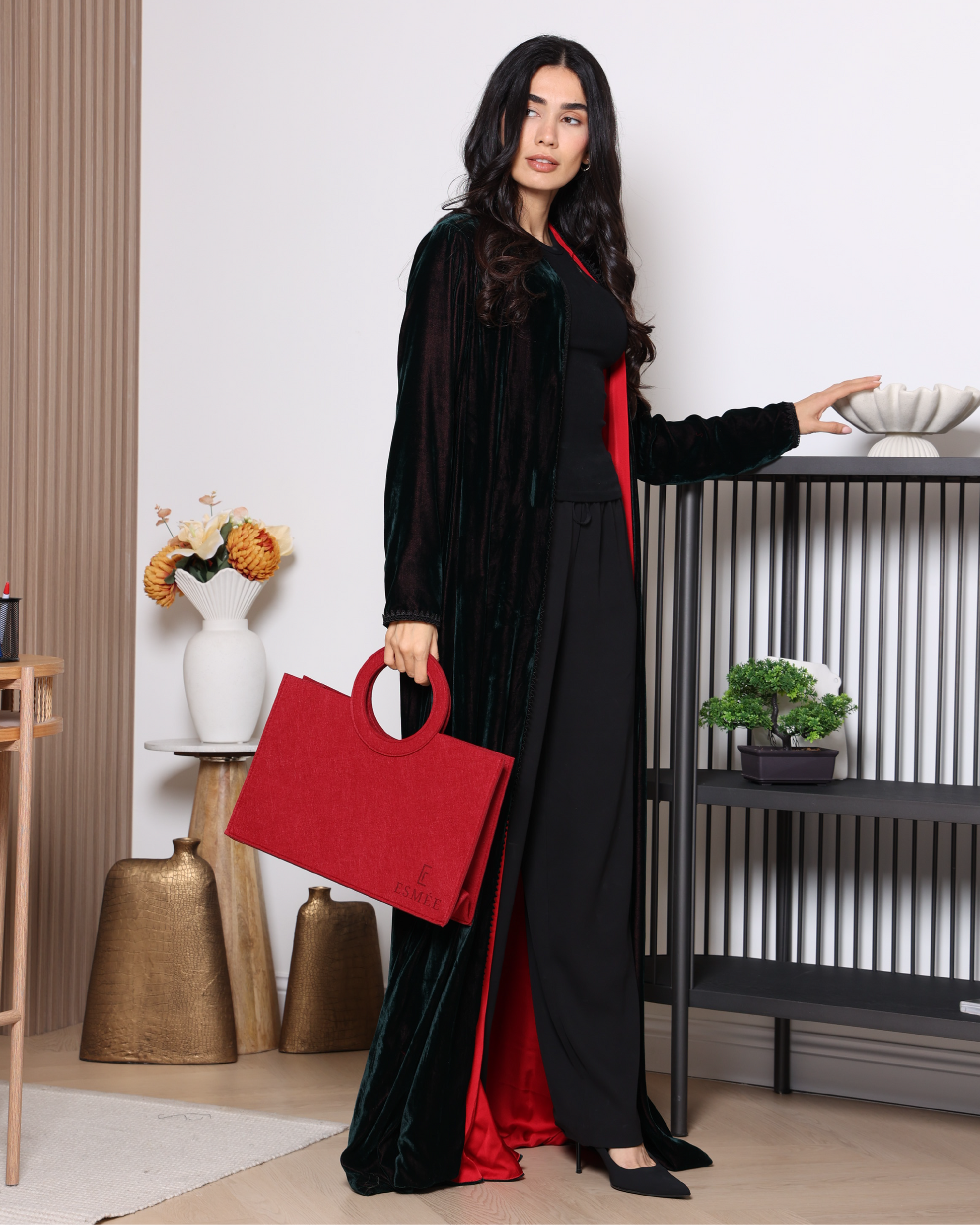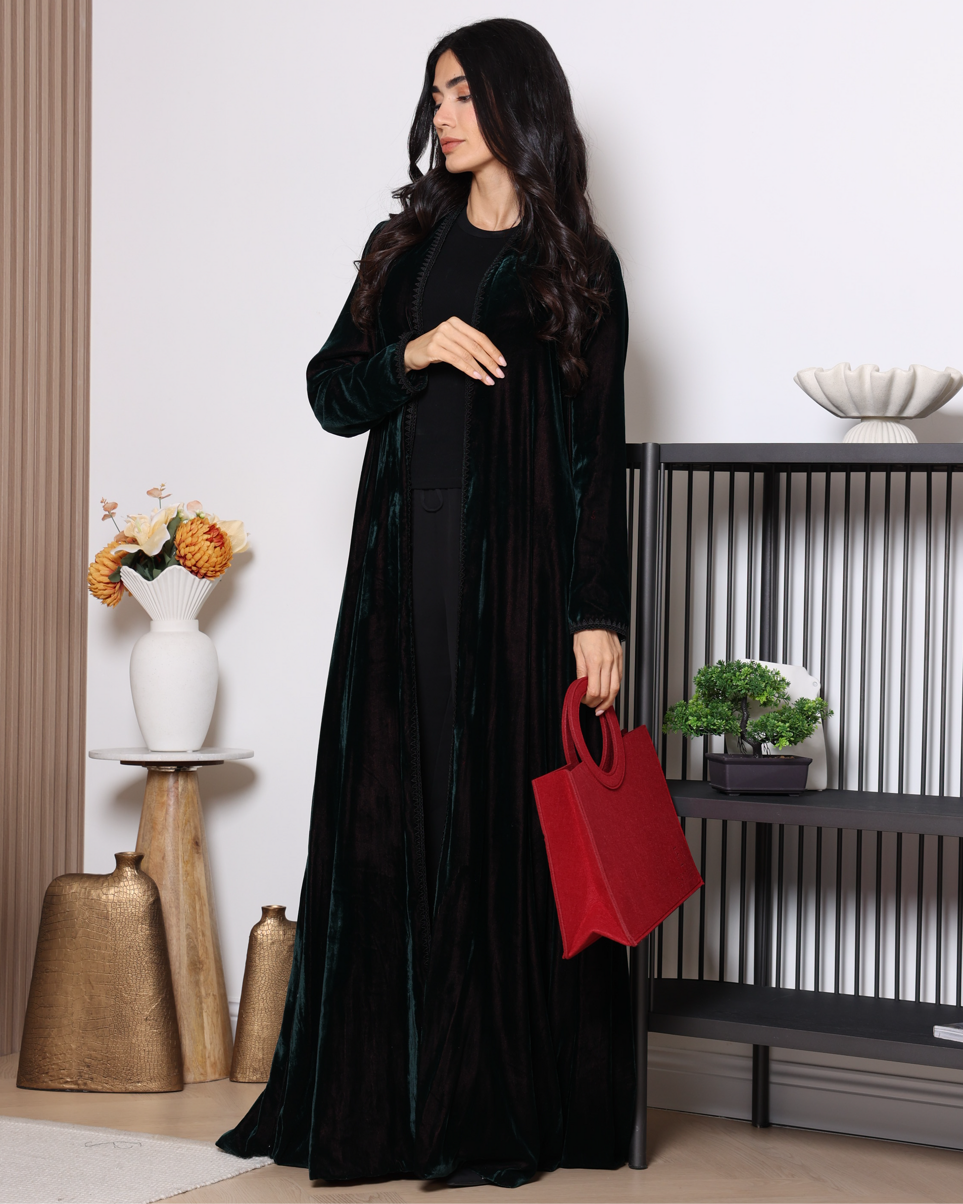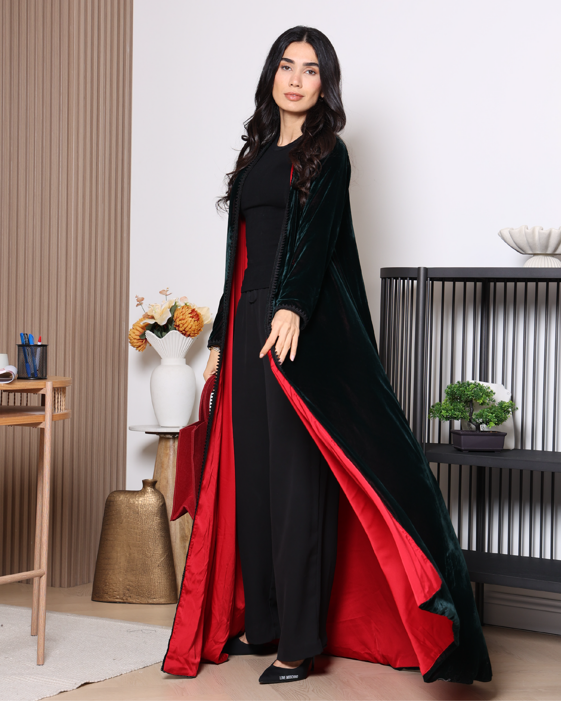 A dark green velvet abaya lined with deep red satin, creating an elegant and striking contrast. Delicate black lace trims along the front add a luxurious and refined touch, blending mystery and sophistication in a unique design perfect for both formal occasions and everyday wear.