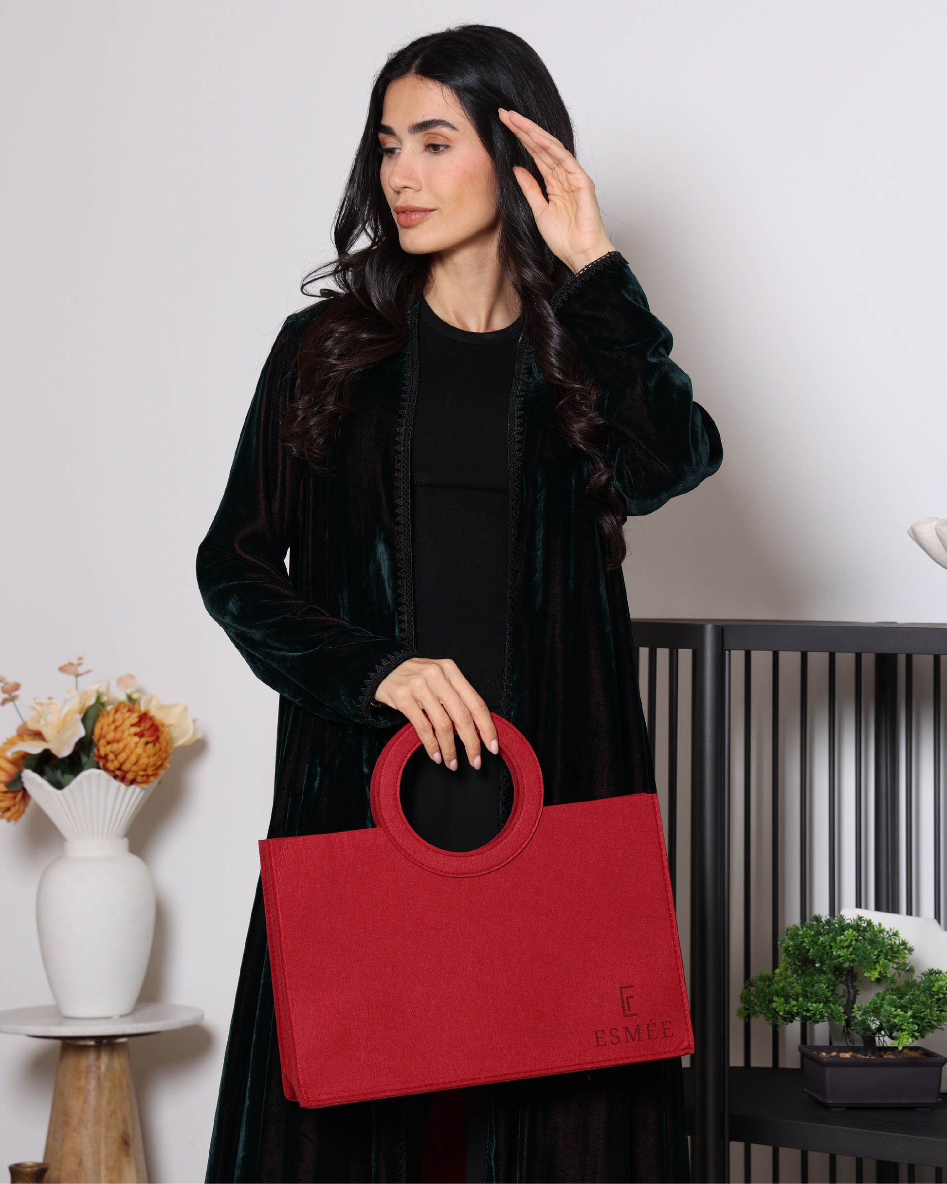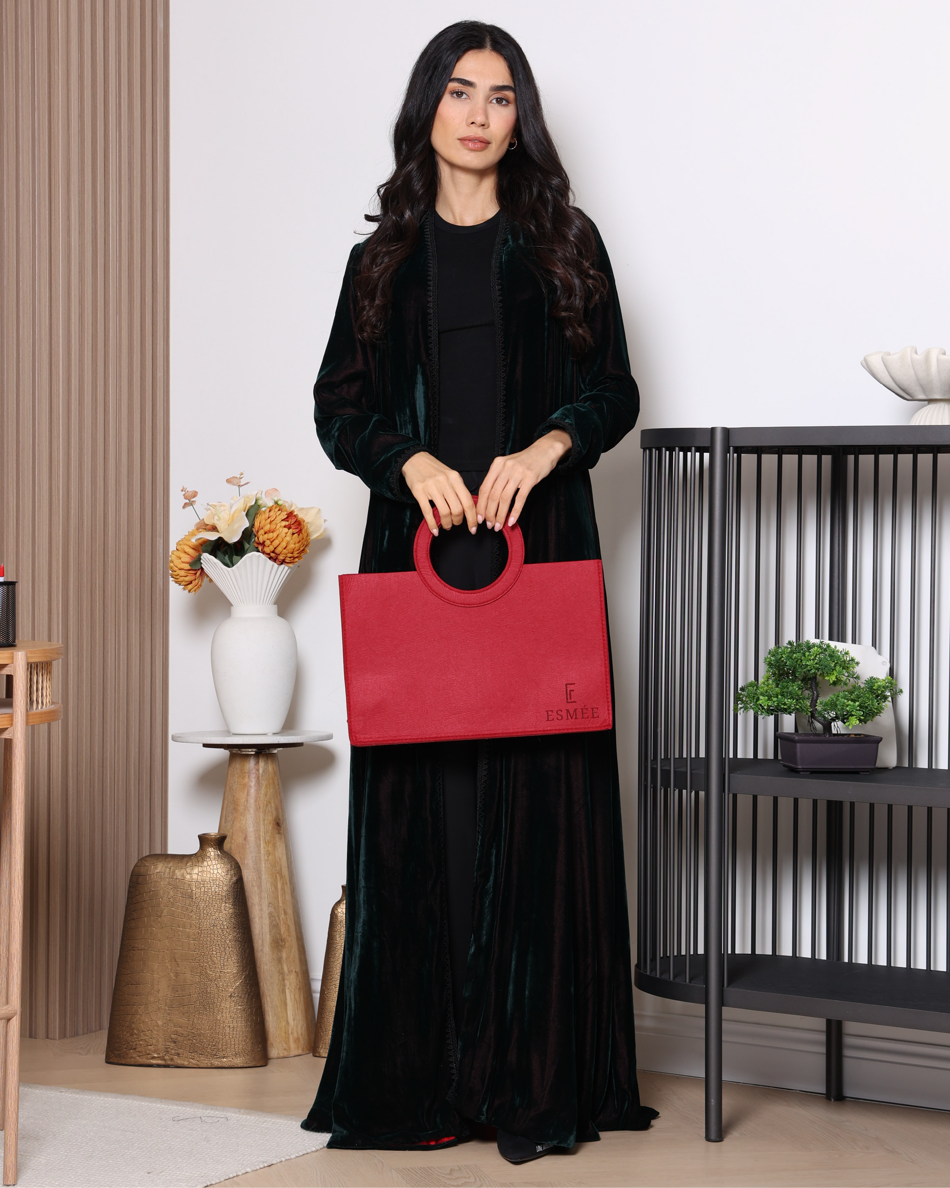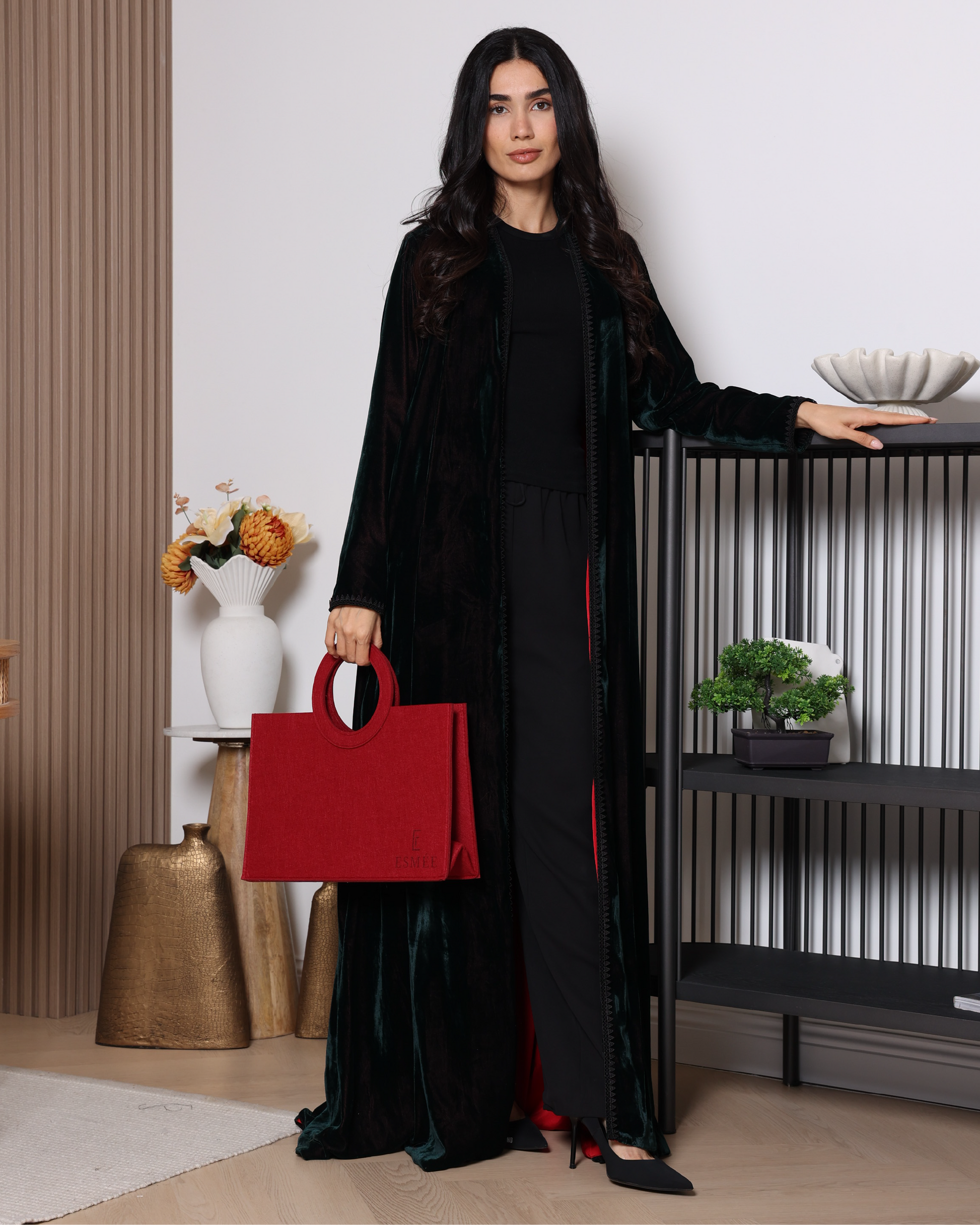 A dark green velvet abaya lined with deep red satin, creating an elegant and striking contrast. Delicate black lace trims along the front add a luxurious and refined touch, blending mystery and sophistication in a unique design perfect for both formal occasions and everyday wear.