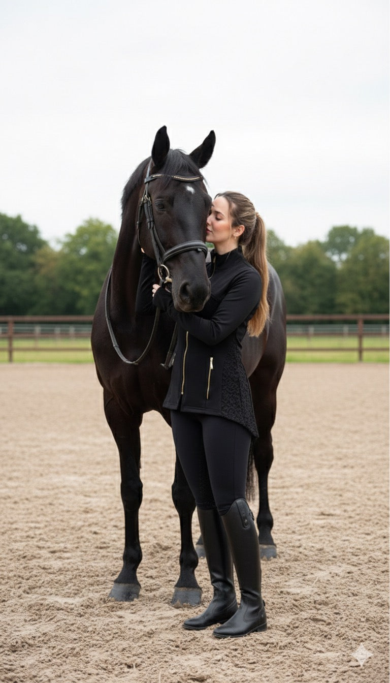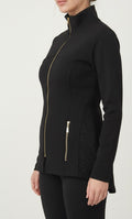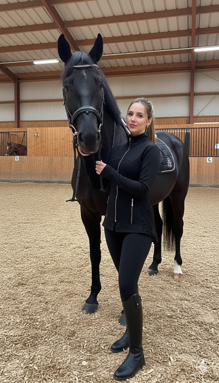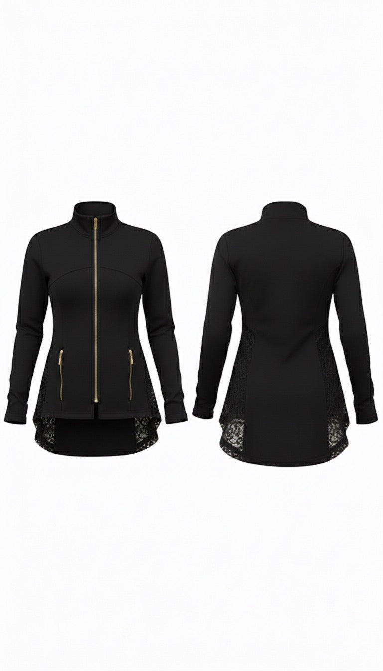 Lace-Detail Performance Jacket A perfect blend of athletic performance and feminine elegance. This sleek black jacket features premium stretch fabric with intricate lace paneling, offering a sophisticated look for both fitness and daily lifestyle.