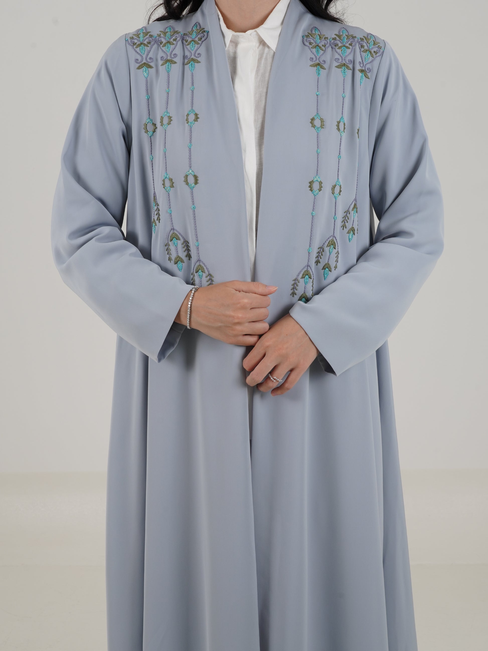 The Siba Abaya comes in a soft baby blue color, designed with an elegant A-line cut for a flattering silhouette. It is beautifully crafted with delicate embroidery on the front, adding a refined and graceful touch to the overall look.