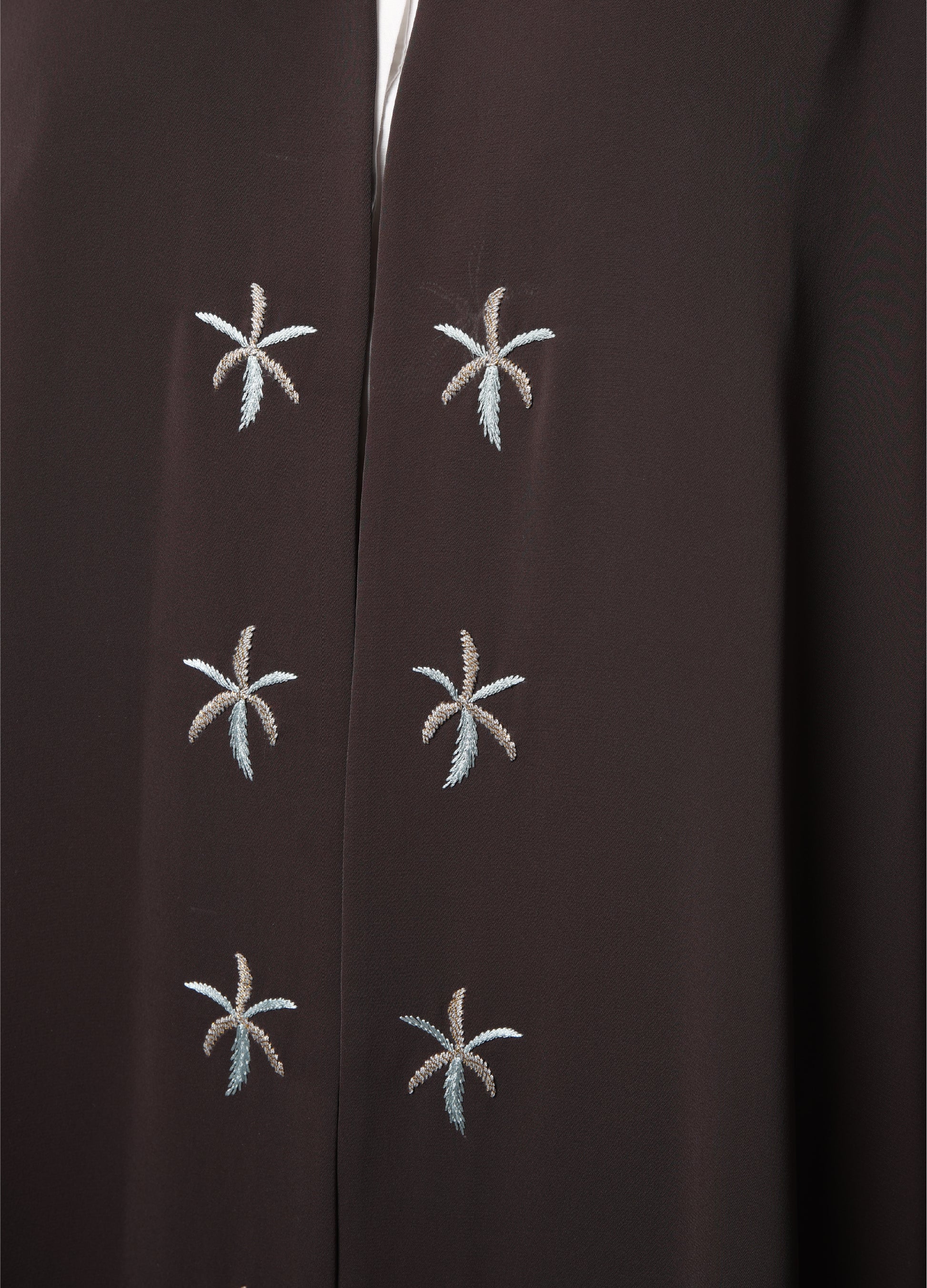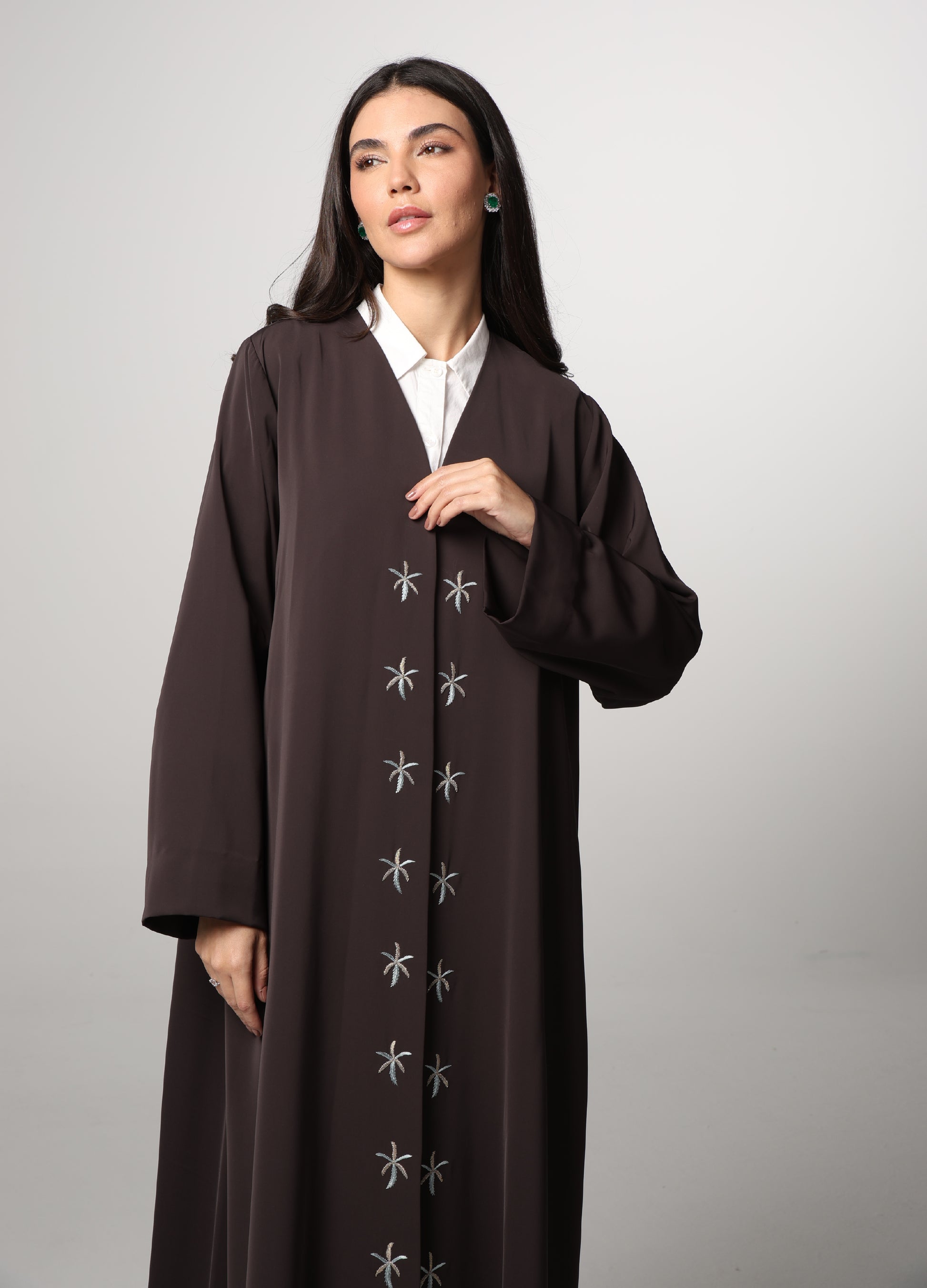 The Maysam Abaya, crafted from lightweight crepe fabric in a brown shade, is delicately embroidered to reflect understated elegance and effortless grace.