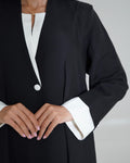 Designed from a lightweight linen blend in classic black with a white collar and cuffs, offering a delicate yet professional look — perfect for work.